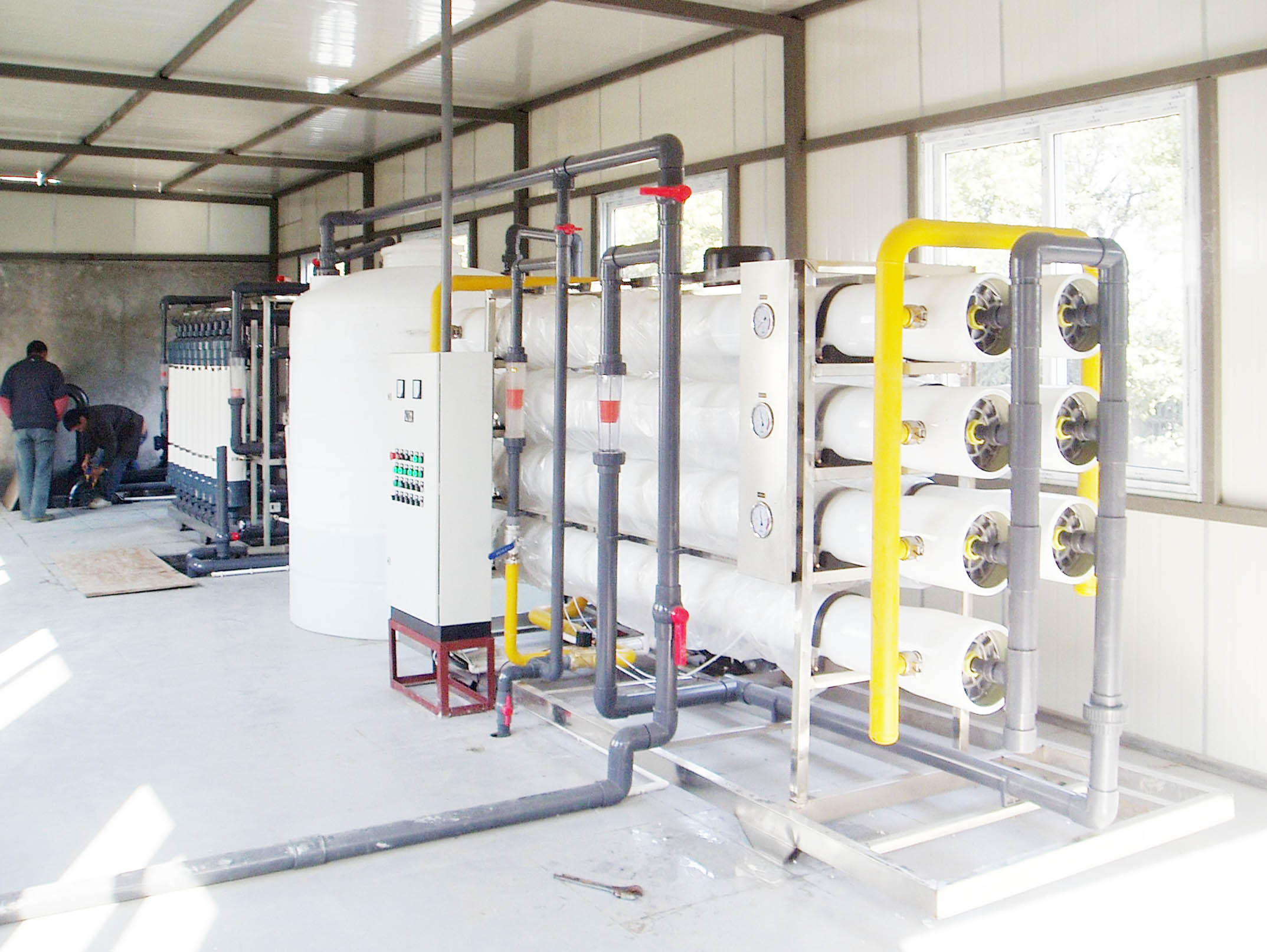 2、預(yù)處理→一級反滲透→加藥機(jī)(PH調(diào)節(jié))→中間水箱→第二級反滲透(正電荷反滲膜)→純水箱→純水泵→EDI裝置→紫外線殺菌器→精密過濾器→用水對象(≥17MΩ.CM)